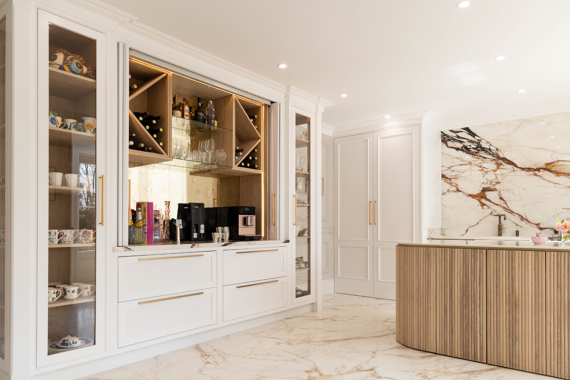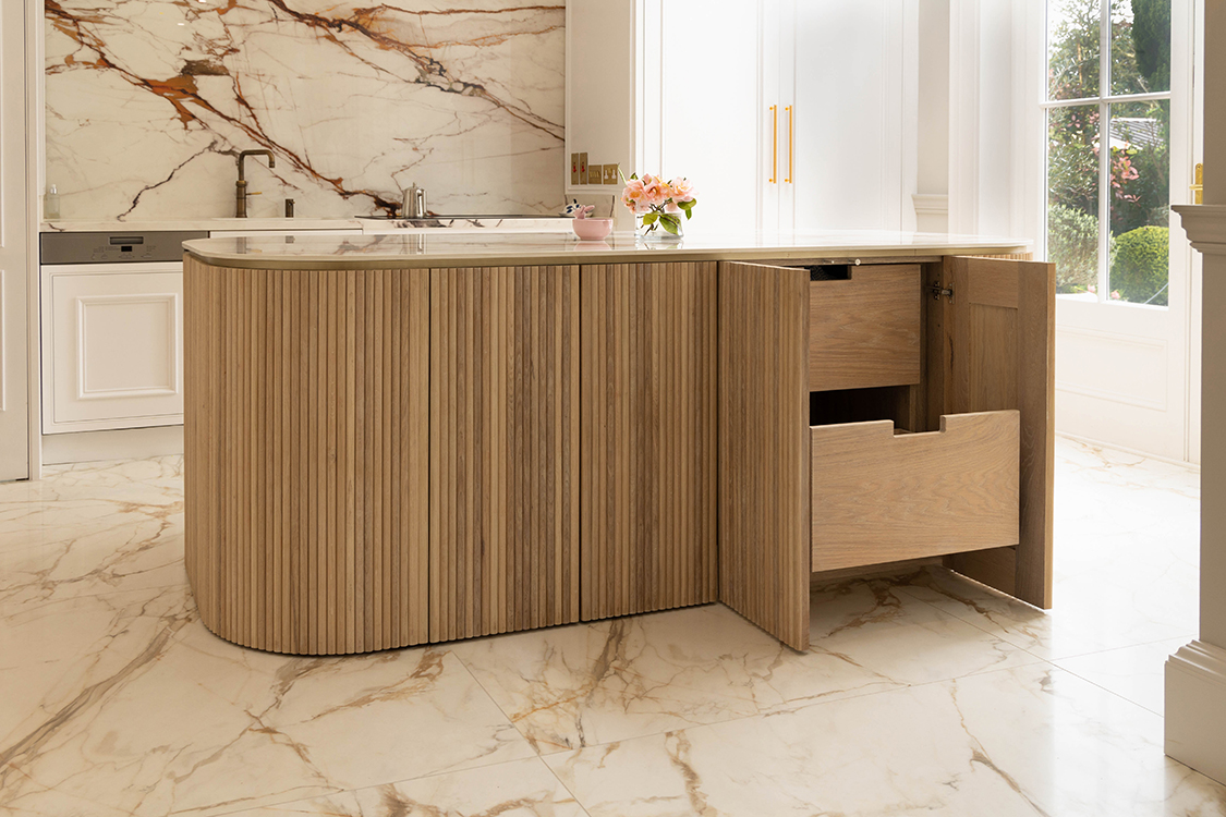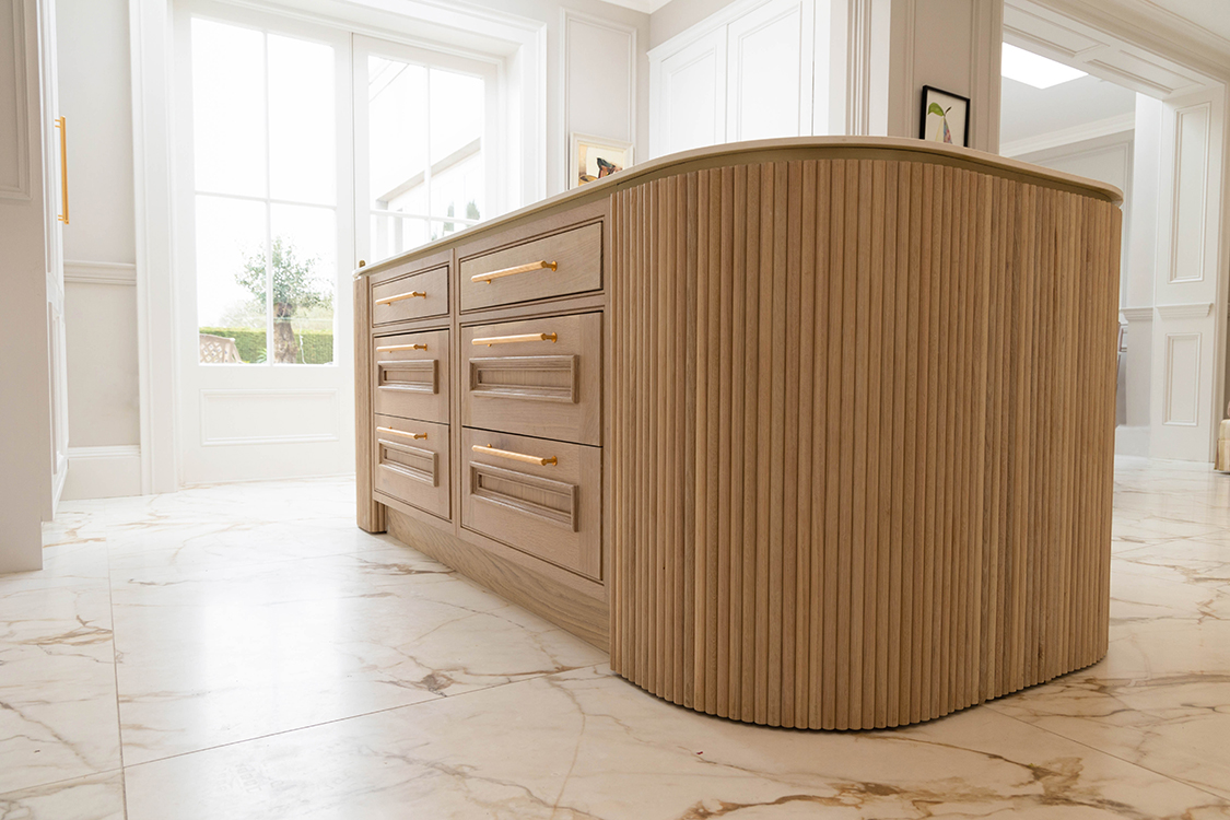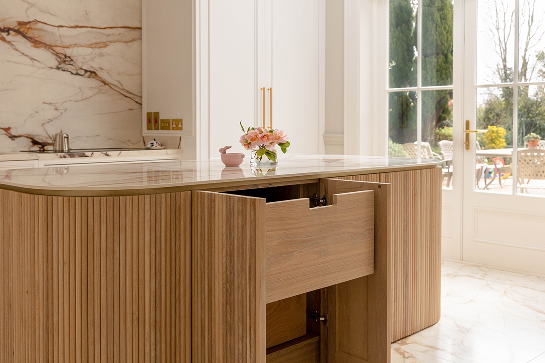 A stunning kitchen for a stunning home. A washed oak island handcrafted to perfection with exquisite fluted oak paneling and some clever hidden storage.