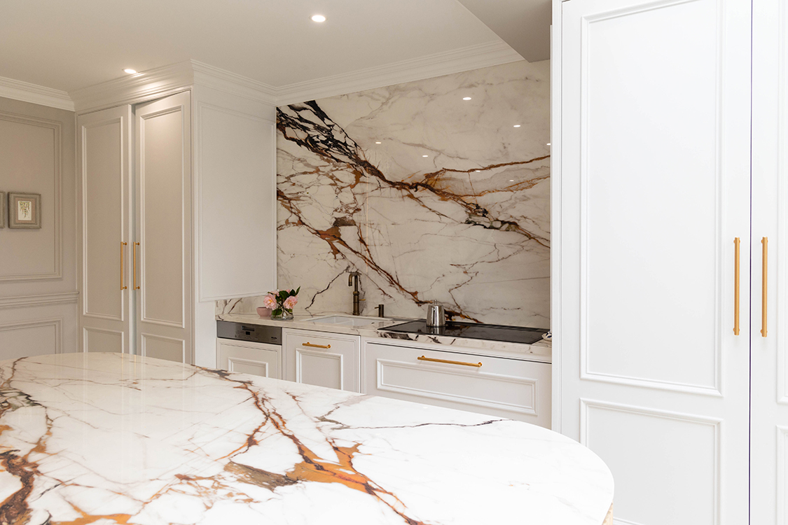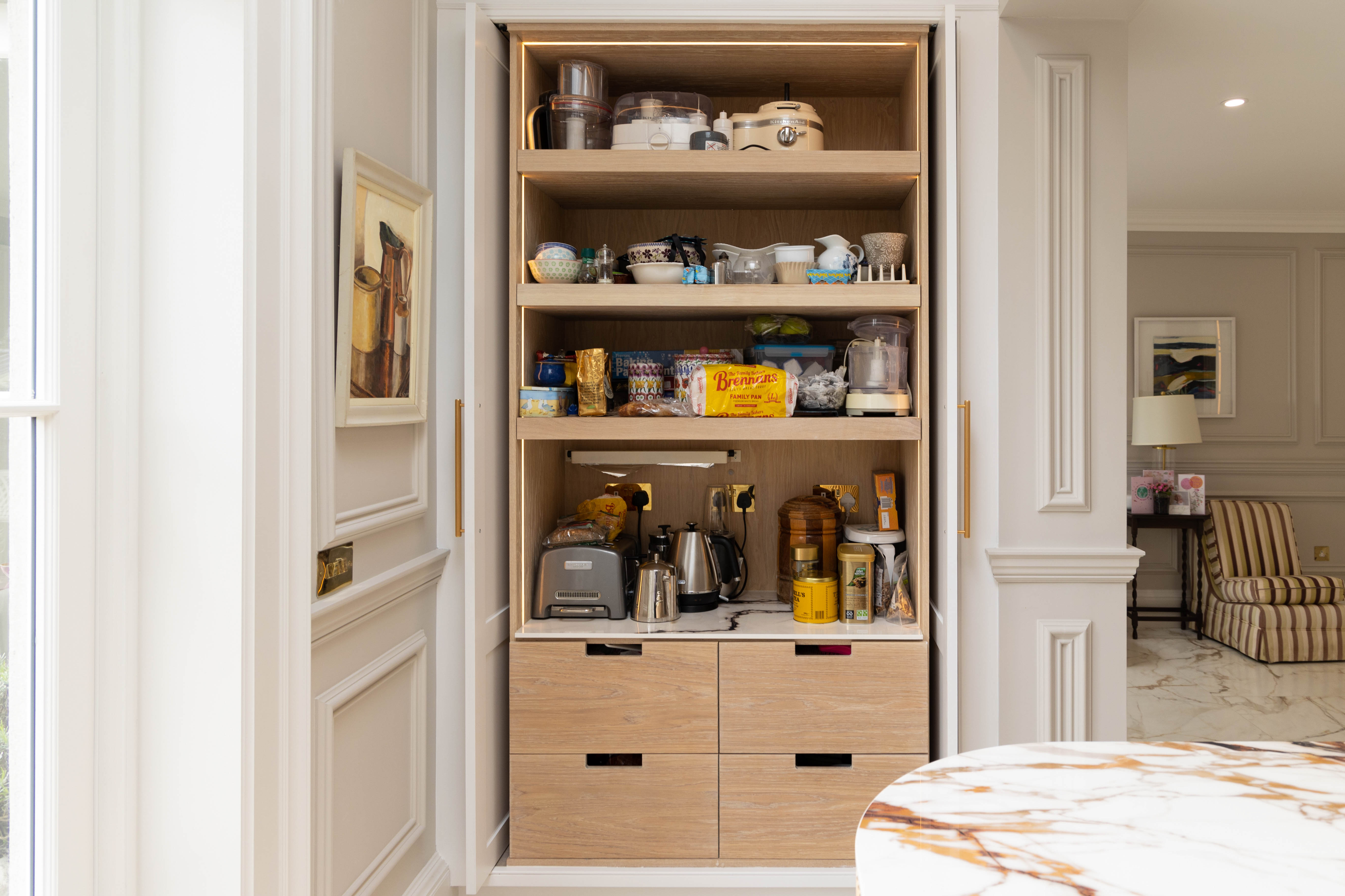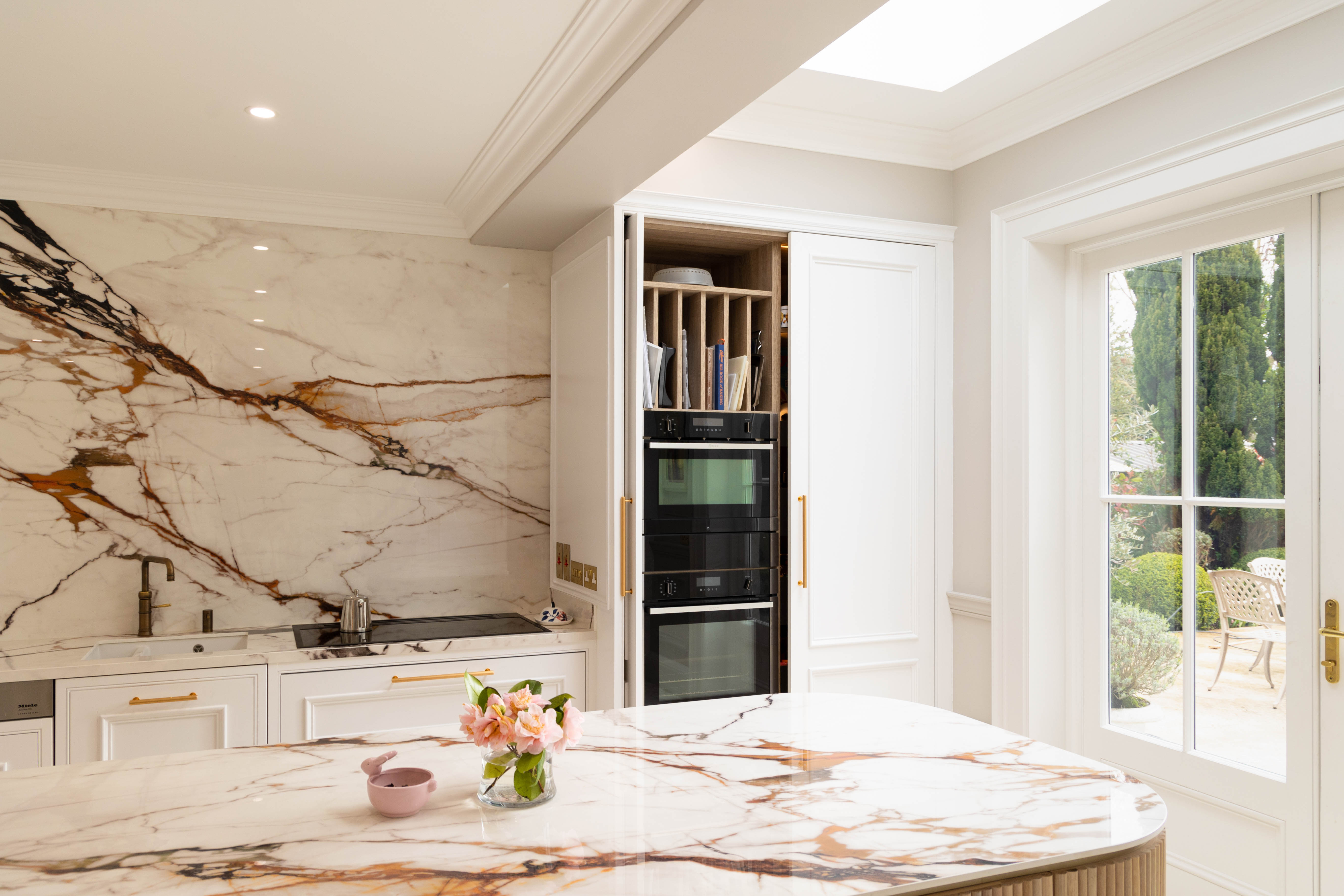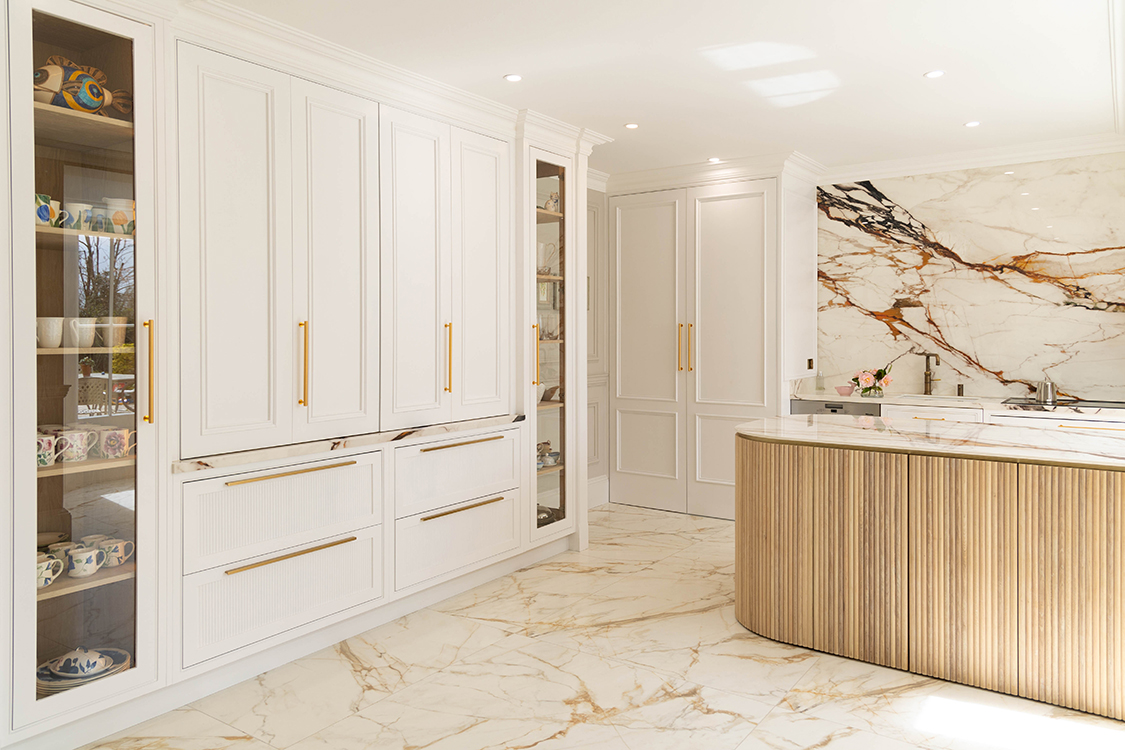 A stunning kitchen for a stunning home. A washed oak island handcrafted to perfection with exquisite fluted oak paneling and some clever hidden storage.