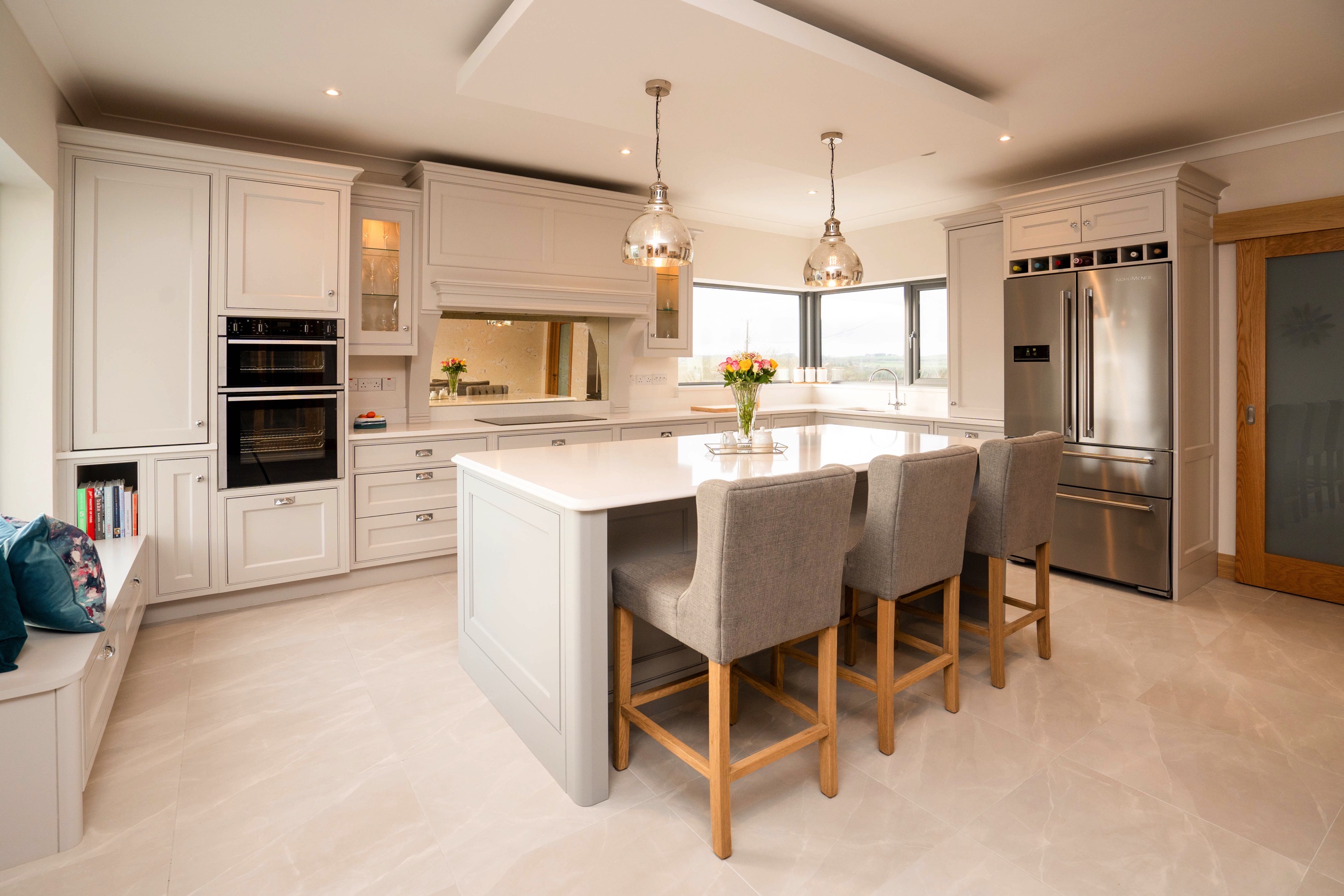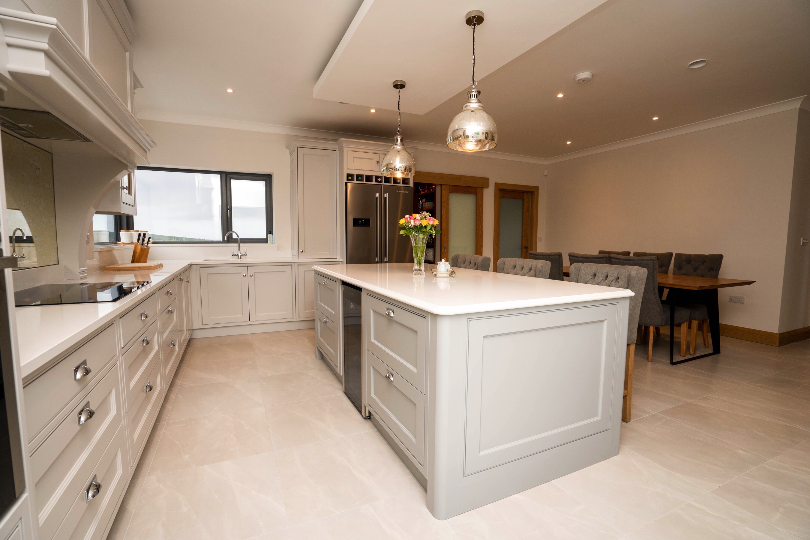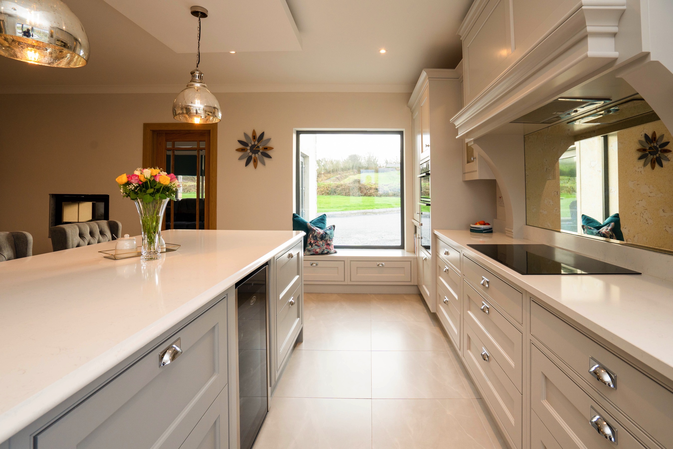 Our client's choice of worktop really brings warmth to this home. Having an island shape that incorporates a simple yet advantageous seating area creates further space within this overall room and really brings that family feel and togetherness to a home. The general kitchen appliances that can be found on your worktop can be neatly hidden from the eye, behind the bespoke counter cabinet with our bi-folding doors neatly showcasing them.