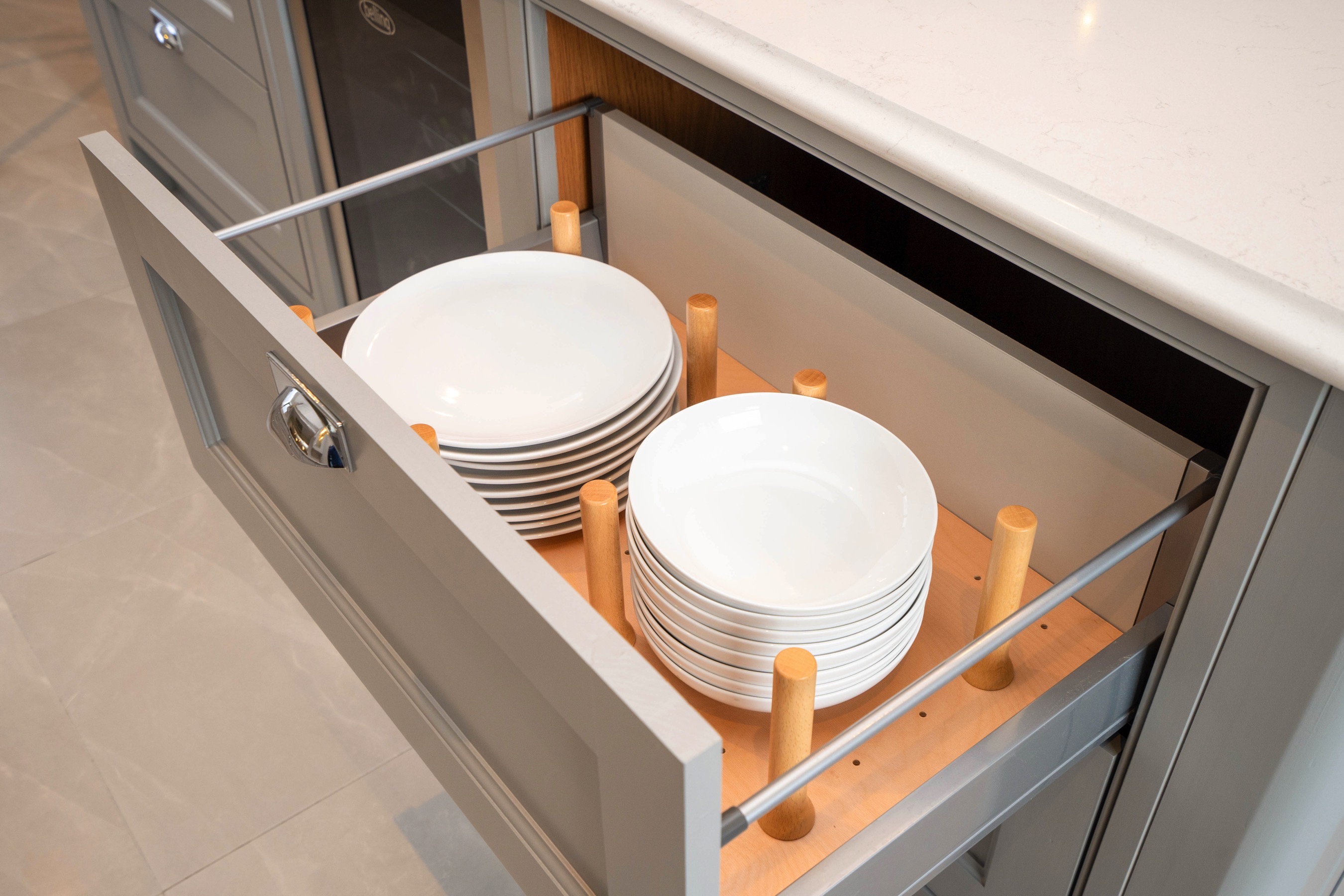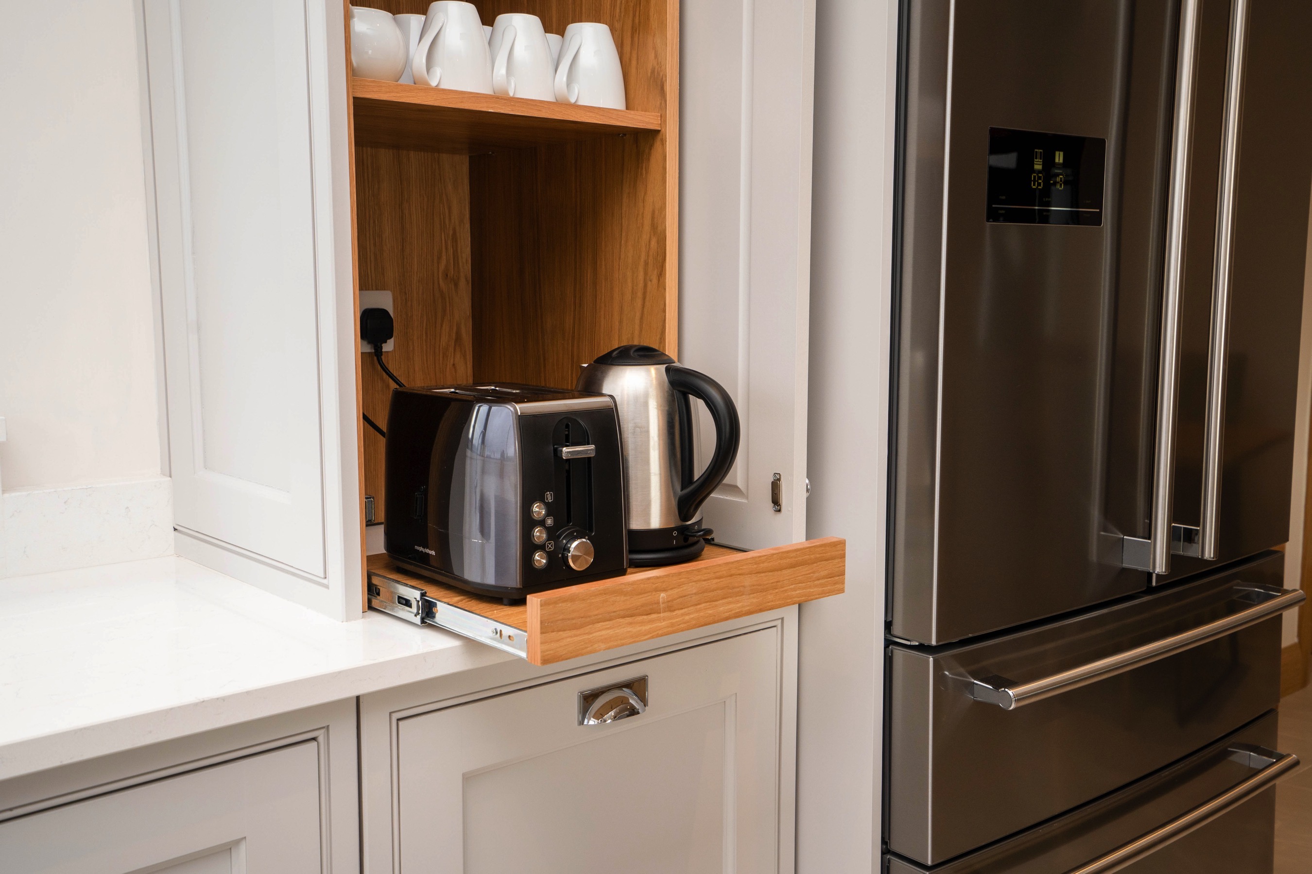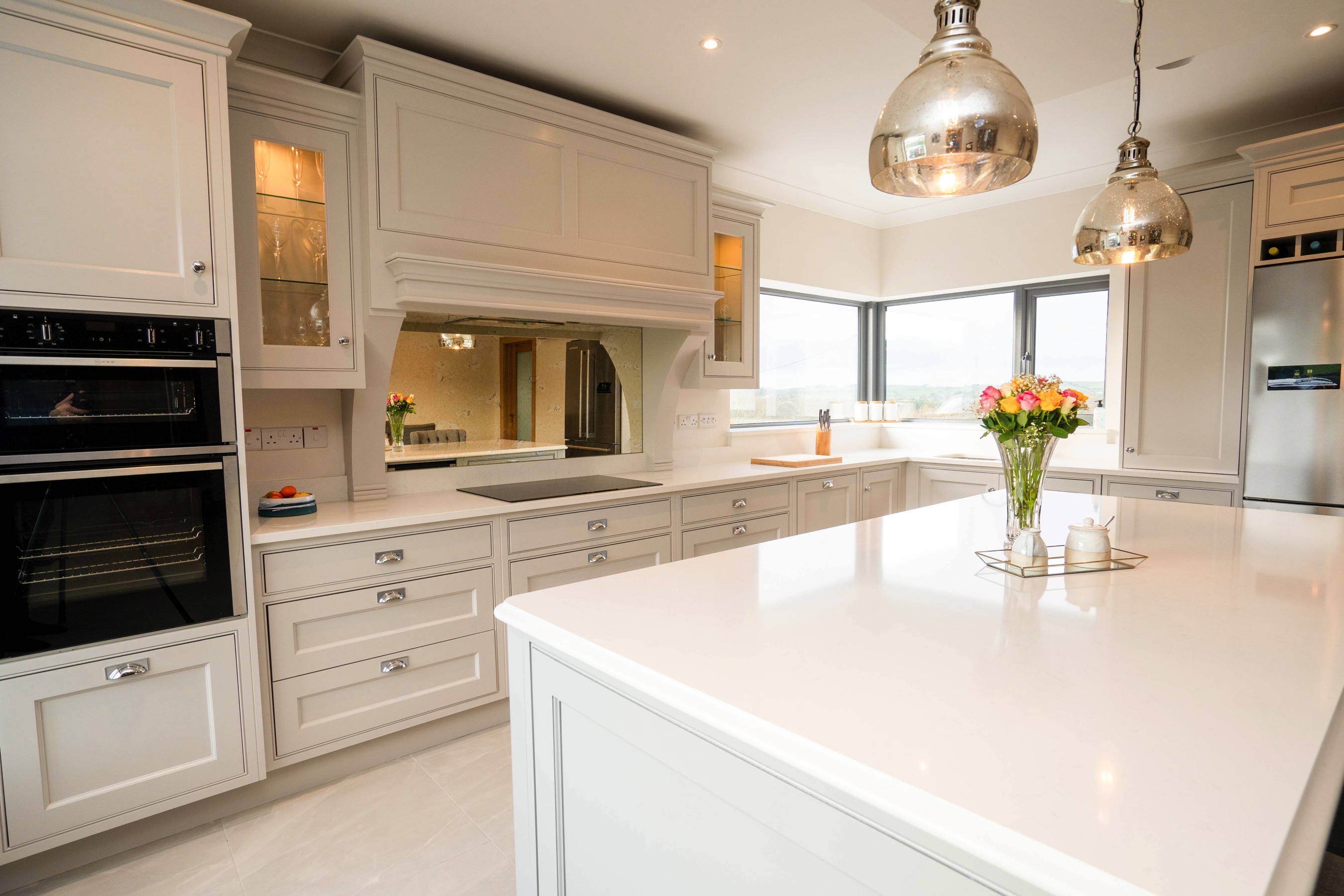 Our client's choice of worktop really brings warmth to this home. Having an island shape that incorporates a simple yet advantageous seating area creates further space within this overall room and really brings that family feel and togetherness to a home. The general kitchen appliances that can be found on your worktop can be neatly hidden from the eye, behind the bespoke counter cabinet with our bi-folding doors neatly showcasing them.
