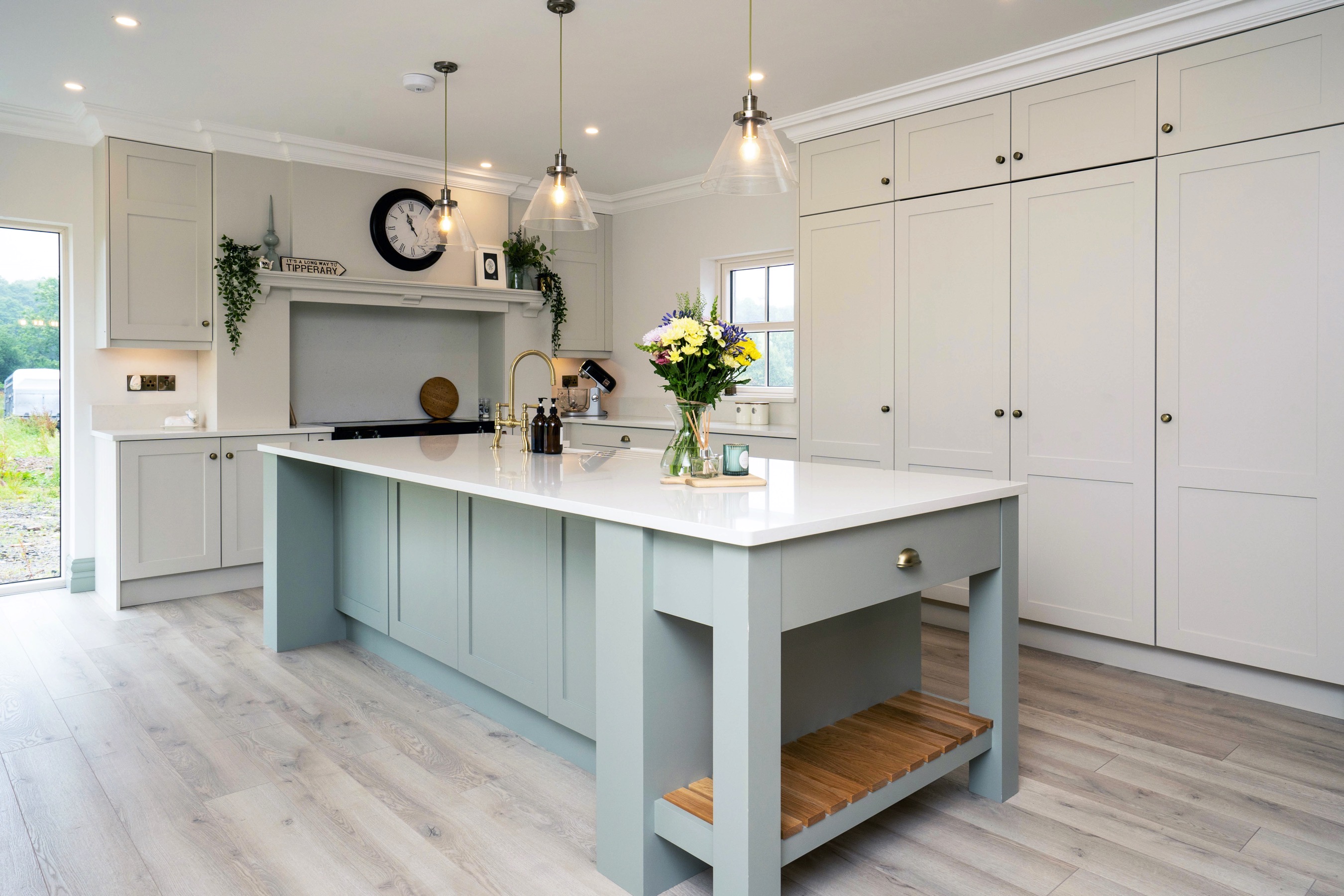 In keeping with its location and style of home, we love how a modern style shaker kitchen with some soft colour tones has helped tie this whole room together. Plants in a room are often undermined, but bring a great sense of freshness, particularly when paired with some bronze resources, like a kitchen tap and door handles. We also love the customer request to engrave the pantry drawers and put a unique stamp on the room.